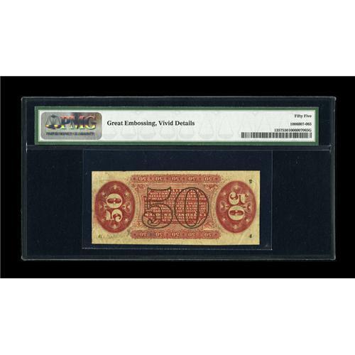 <B>Fr. 1357 50¢ Third Issue Justice Inverted Back Engraving PMG About Uncirculated 55.</B></I> PMG comments, "Great Embossing, Vivid Details," on this high-end AU 1357 Invert. As a normal note without the inverted engraving, this would be a $1000-plus note.<BR><BR><b>Shipping:</b> Coins & Currency (<a target="_blank" href="http://www.heritageauctions.com/common/shipping.php">view shipping information</a>)