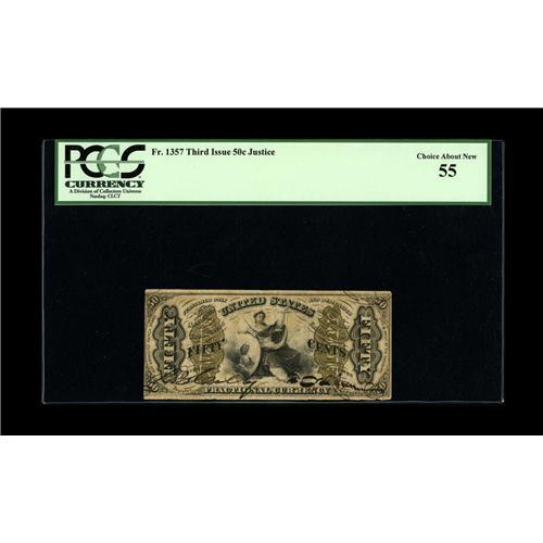 <B>Fr. 1357 50c Third Issue Justice PCGS Choice About New 55.</B></I> A very nice example of this scarce Red Back hand-signed, fiber paper Justice. There is a little roughness at the outer edge of the generous top and bottom margins, but the note is free of folds and any signs of actual circulation. Excellent embossing remains.<BR><BR><b>Shipping:</b> Coin/Currency (<a target="_blank" href="http://www.heritageauctions.com/common/shipping.php">view shipping information</a>)