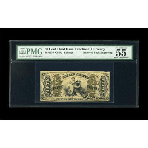 <B>Fr. 1357 50¢ Third Issue Justice Inverted Back Engraving PMG About Uncirculated 55.</B></I> PMG comments, "Great Embossing, Vivid Details," on this high-end AU 1357 Invert. As a normal note without the inverted engraving, this would be a $1000-plus note.
