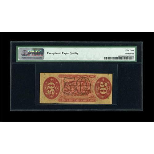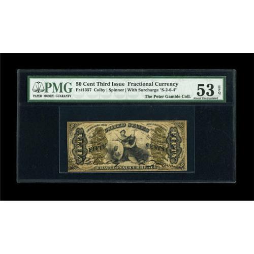 <B>Fr. 1357 50¢ Third Issue Justice PMG About Uncirculated 53 EPQ.</B></I> The numerical designation seems right on the money, if not a tad conservative. A tough note to find without any traces of damage as this brittle fiber paper cracked and chipped with ease.<BR><I>From The Peter Gamble Collection.</B></I><BR><BR><b>Shipping:</b> Coins & Currency (<a target="_blank" href="http://www.heritageauctions.com/common/shipping.php">view shipping information</a>)
