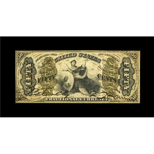 <B>Fr. 1357 50c Third Issue Justice About New.</B></I> This hand-signed Red Back Fiber Paper Justice is a scarce and underrated note in all grades. This example, in spite of its light circulation, is one of the better pieces we've seen. It's extraordinarily well margined for a Justice note. The pen signatures are strong, the surfaces are strictly original and the bronze reflectively bright. In our opinion, high-quality circulated notes like this one should be worth more money than the higher-priced, scruffy uncirculated pieces that tend to appear.<BR><BR><b>Shipping:</b> Coins & Currency (<a target="_blank" href="http://www.heritageauctions.com/common/shipping.php">view shipping information</a>)