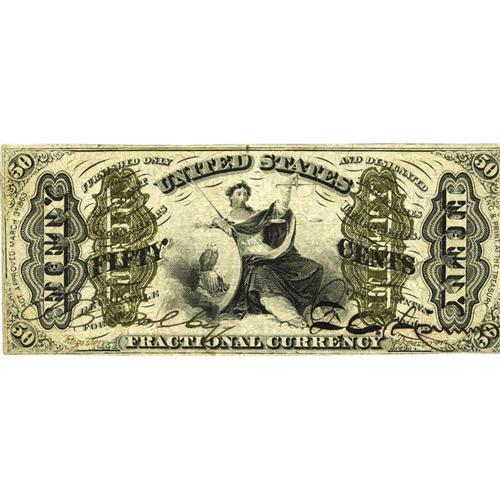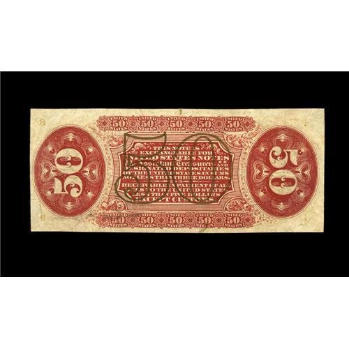 <B>Fr. 1357 50c Third Issue Justice About New.</B></I> This is a very attractive example of this scarce and underrated fiber paper variety that has good eye appeal for the grade. The back reveals bold ink color but the surcharges are somewhat subdued and there is a tiny repaired edge nick at the top.