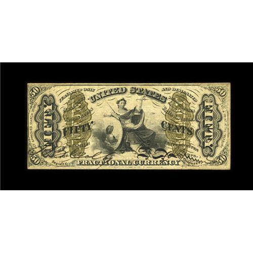 <B>Fr. 1357 50c Third Issue Justice Choice New.</B></I> Fr. 1357 is a rare note in this grade. Over the years we have seen very few graded New or better. In fact, we have never handled a gem of this number. This piece is among the very nicest we've seen. It's very well printed on extremely heavy Fiber Paper. The paper color is a bit toned, as always, and the margins, although close, are complete all the way around. The signatures are strong, and the original embossing is present.<BR><BR><b>Shipping:</b> Coin/Currency (<a target="_blank" href="http://www.heritageauctions.com/common/shipping.php">view shipping information</a>)