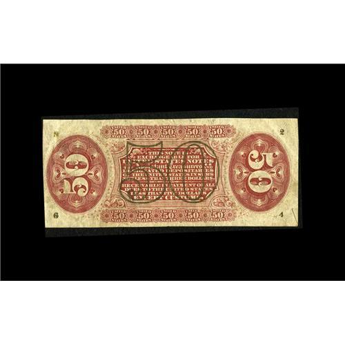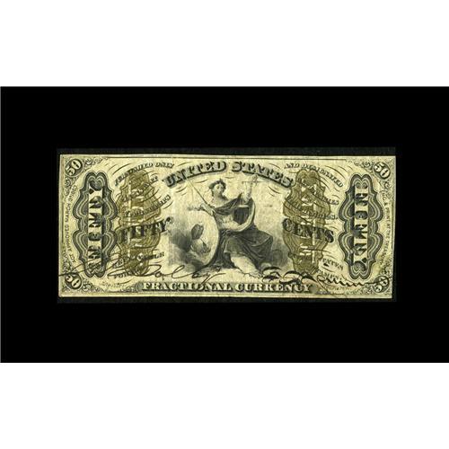 <B>Fr. 1357 50c Third Issue Justice Extremely Fine.</B></I> A bit soiled on the back, and the folds appear heavier than they do on the attractive face, but the overall appearance of the note is excellent and it's totally free of problems, repairs or damage that typically plague these Fiber Paper Justices. The margins are free of the frame-line all the way around, and although they're small in places, they never touch. Overall, a very nice example