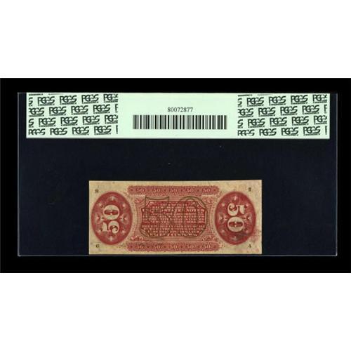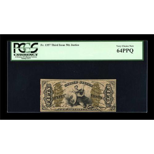 <B>Fr. 1357 50c Third Issue Justice PCGS Very Choice New 64PPQ.</B></I> This Fiber Paper hand-signed Red Back Justice note is very scarce in all grades, and it can be considered truly rare as nice as this example. The note is decently margined, with rather strong color, good signatures and excellent original paper embossing. In all our sales, we've handled only nine uncirculated Fr. 1357's, and only four were as nice as this. Each of the major services has graded only a single VCN 64 Fr. 1357, with none higher.<BR><I>From The Thomas M. Flynn Collection</B></I><BR><BR><b>Shipping:</b> Coins & Currency (<a target="_blank" href="http://www.heritageauctions.com/common/shipping.php">view shipping information</a>)