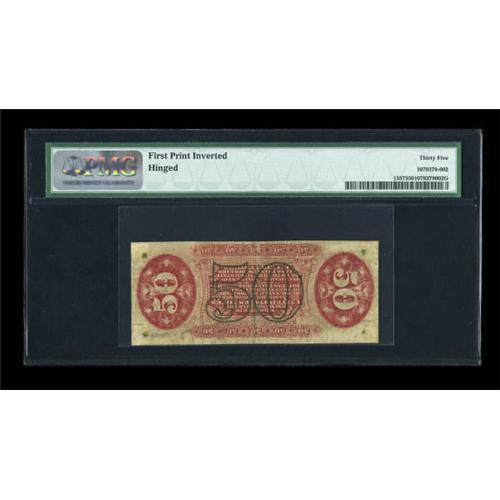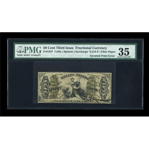 <B>Fr. 1357 50c Third Issue Justice Inverted Back Engraving PMG Choice Very Fine 35.</B></I> In spite of the fact that this is a much scarcer Friedberg number, this is actually one of the more common Fractional Inverts, with over a dozen examples known. PMG has noted, "First Print Inverted," as well as, "Hinged."<BR><BR><b>Shipping:</b> Coins & Currency (<a target="_blank" href="http://www.heritageauctions.com/common/shipping.php">view shipping information</a>)