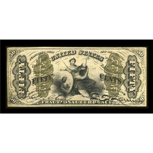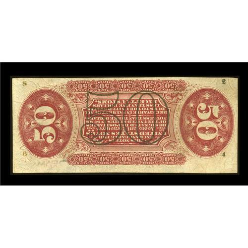 <B>Fr. 1357 Milton 3R50.6a 50¢ Third Issue Justice Inverted Back Engraving Gem New.</B></I> Even if this were not an Invert, it would still be one of the two finest Fr. 1357's that we have seen. It's incredibly bright for a Fiber Paper note, with great margins for a Justice, all its original embossing, bright bronze and a bold "S-2-6-4" surcharge. The hand signatures are perfect, and the print quality is needle-sharp on both sides all the way out to the edges. Fr. 1357 is a scarce note in all grades, and it becomes truly rare in Choice and Gem. Interestingly, the note is the most common 50¢ Third Issue Invert, with about a dozen examples known, almost all of which are quite well circulated. Fr. 1357 is also the only known Red Back 50¢ Third Issue Invert, including both Spinners and Justices. As a non-Invert, on the basis of its Friedberg number and grade only, this note would sail past the $3,000 mark. As an Invert, the estimate becomes more unpredictable, but our best guess is . . .