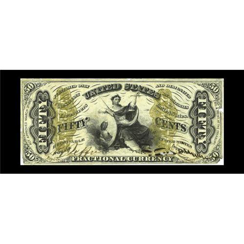 <B>Fr. 1357aSP 50c Third Issue Narrow Margin Face Specimen Justice About New.</B></I> This number only exists as a specimen with this example displaying a reflective bronze overprint. It was also once mounted. The removal led to repairs on the back and edge nicks. Another repair was made to Spinner's autographed signature due to ink erosion.
