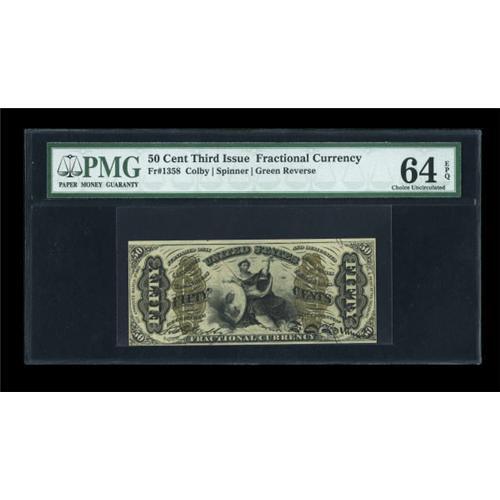 <B>Fr. 1358 50c Third Issue Justice PMG Choice Uncirculated 64 EPQ.</B></I> This handsome Green Back Justice, with its "Exceptional Paper Quality" designation, is about as close to Gem as a note can get without quite being there. Very tough to find in this high a grade.<BR><BR><b>Shipping:</b> Coins & Currency (<a target="_blank" href="http://www.heritageauctions.com/common/shipping.php">view shipping information</a>)