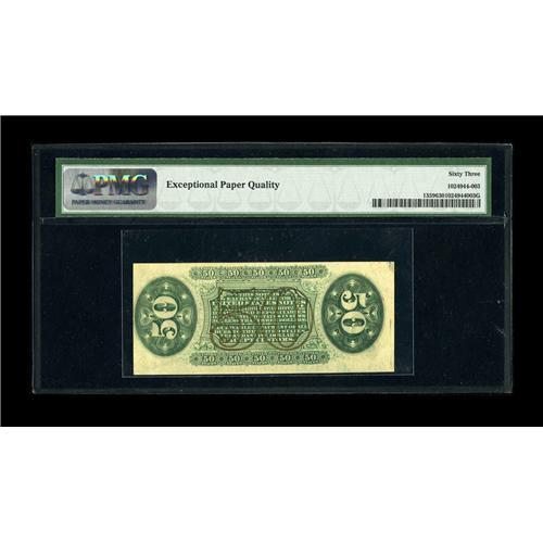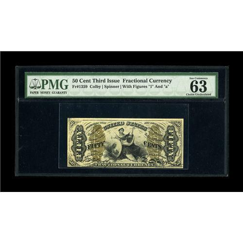 <B>Fr. 1359 50c Third Issue Justice PMG Choice Uncirculated 63 EPQ.</B></I> An exceptional example of this very scarce number with "1" and "a" on the face which has far better margins than 90% of the two dozen or so examples extant. With the recent emphasis placed upon rare notes and high quality notes, this piece should see considerable bidding action as it combines those two elements to form a real prize for one lucky collector. As another cataloger added to a similarly graded Fr. 1359, "We've seen very few examples of this rare number that stand even a prayer of garnering a higher third-party grade than this very pretty piece."<BR><BR><b>Shipping:</b> Coin/Currency (<a target="_blank" href="http://www.heritageauctions.com/common/shipping.php">view shipping information</a>)