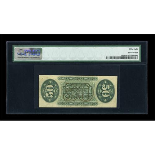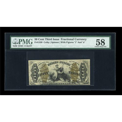 <B>Fr. 1359 50c Third Issue Justice PMG Choice About Unc 58.</B></I> Even with its AU grade, this very rare Fr. 1359 is one of the better examples of the number in existence. Only about 20 examples of this number are known in all grades, and this is generally considered to be the sixth or seventh rarest Fractional number.<BR><BR><b>Shipping:</b> Coins & Currency (<a target="_blank" href="http://www.heritageauctions.com/common/shipping.php">view shipping information</a>)