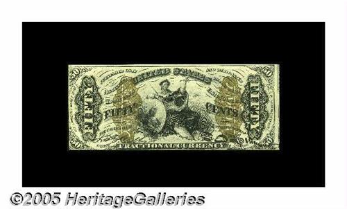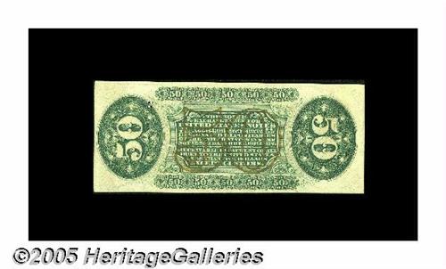 <B>Fr. 1359 Milton 3R50.13a 50¢ Third Issue Justice Choice New.</B></I> Gem but for the centering. There are only about 20 or so examples known, and very few uncirculated pieces. This one has all its original embossing, sharp printing and ideal color. It is unfortunately cut past the frame line at both the left and bottom. The cut is similar to, but not as drastic as, the Milt Friedberg example.