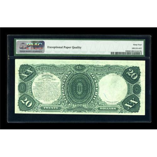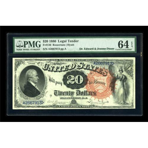 <B>Fr. 136 $20 1880 Legal Tender PMG Choice Uncirculated 64 EPQ.</B></I> This handsome Large Red Spiked Seal 1880 $20 Legal has earned PMG's "Exceptional Paper Quality" comment. The margins are not perfectly even, but they are certainly broad enough at all points to support the 64 grade. This note, which features a stately portrait of Alexander Hamilton, is pictured on page 99 of the Dauers' 400 page book.<BR><I>From The Dr. Edward & Joanne Dauer Collection</B></I><BR><BR><b>Shipping:</b> Coins & Currency (<a target="_blank" href="http://www.heritageauctions.com/common/shipping.php">view shipping information</a>)