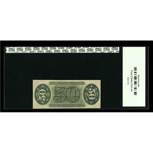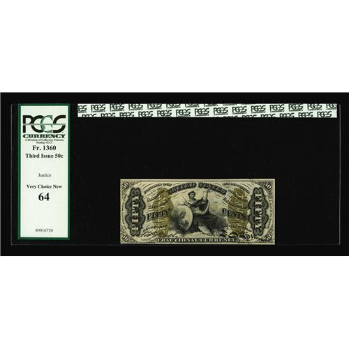 <B>Fr. 1360 50c Third Issue Justice PCGS Very Choice New 64.</B></I> Plenty of deep embossing is seen through the holder on this exquisite example. Would the left margin have been a tad wider this note certainly would have fared better.