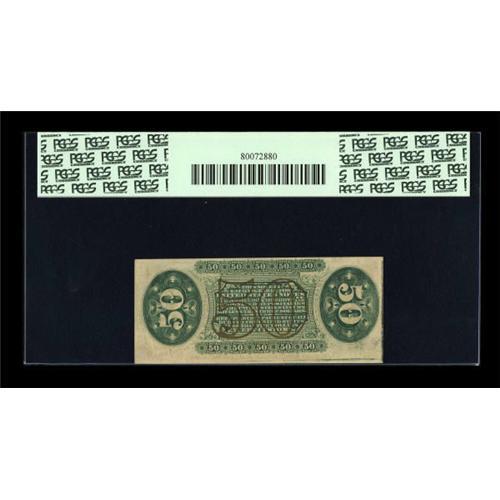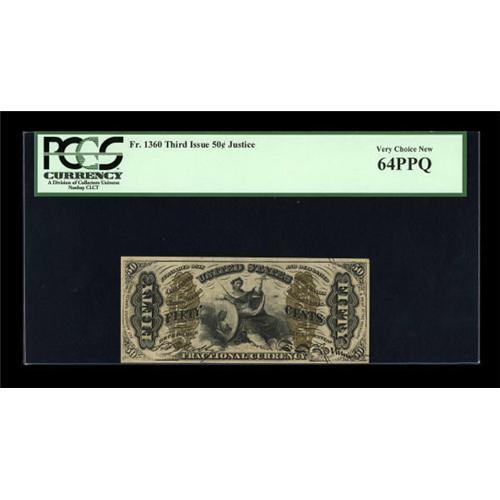 <B>Fr. 1360 50c Third Issue Justice PCGS Very Choice New 64PPQ.</B></I> A rather tough number, and unusually well margined for a Justice. The ink and bronze colors are terrific, but the paper is a touch toned down. That is likely all that prevented the full Gem grade on this handsome and very scarce Justice.<BR><I>From The Thomas M. Flynn Collection</B></I><BR><BR><b>Shipping:</b> Coins & Currency (<a target="_blank" href="http://www.heritageauctions.com/common/shipping.php">view shipping information</a>)
