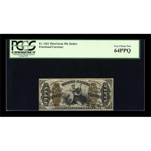 <B>Fr. 1361 50c Third Issue Justice PCGS Very Choice New 64PPQ.</B></I> A touch larger left margin and this well embossed and deeply printed Justice would have certainly been Gem.<BR><BR><b>Shipping:</b> Coins & Currency (<a target="_blank" href="http://www.heritageauctions.com/common/shipping.php">view shipping information</a>)