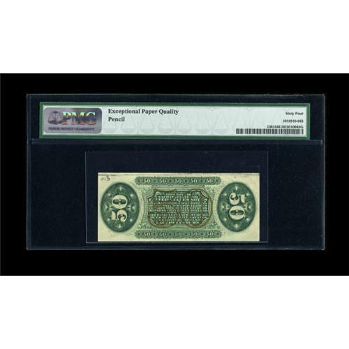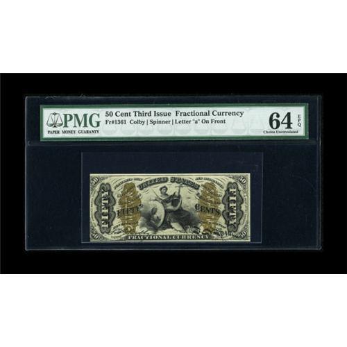 <B>Fr. 1361 50c Third Issue Justice PMG Choice Uncirculated 64 EPQ.</B></I> Bold bronzing highlights this "a" Justice. Some pencil notations on the back are noticed on this otherwise strictly original note.<BR><BR><b>Shipping:</b> Coins & Currency (<a target="_blank" href="http://www.heritageauctions.com/common/shipping.php">view shipping information</a>)