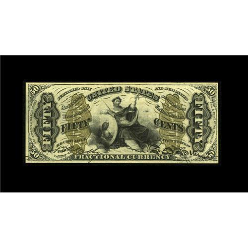<B>Fr. 1361 50c Third Issue Justice Very Choice New.</B></I> . This is a strictly original, well embossed example, with a margin that is clear of the frame line at all points. An interesting feature of this 1361 is an extremely small design letter "a." Fr. 1361 is a difficult number to acquire in top grade, and this is a particularly nice example.