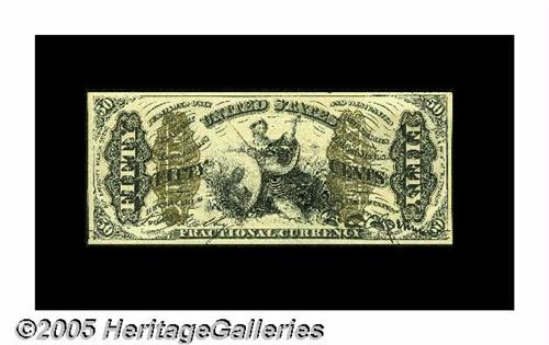<B>Fr. 1361 Milton 3R50.13c 50¢ Third Issue Justice Gem New.</B></I> One of the best margined Justices in this or any collection. The original embossing is pronounced, the colors are excellent, and the back centering is quite good. Very few Justices exist with margins as nice as the ones on this note. The large left face margin has taken the frame line of the next note with it, and the excessive size of the right face margin is the result of the note's being at the edge of the sheet.