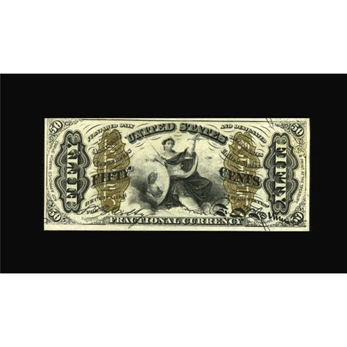 <B>Fr. 1362 50c Third Issue Justice Choice New.</B></I> Good original embossing, blazing bright bronze, and far better-than-average margins make this a highly desirable Green Back Justice. The left end of the top margin comes close to the frame line, save for that, this piece would be a Gem.<BR><BR><b>Shipping:</b> Coins & Currency (<a target="_blank" href="http://www.heritageauctions.com/common/shipping.php">view shipping information</a>)