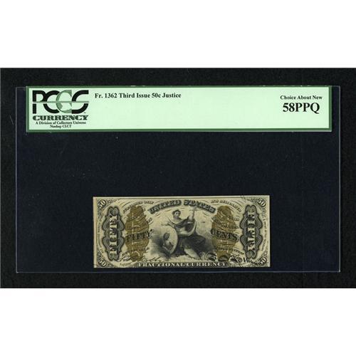 <B>Fr. 1362 50c Third Issue Justice PCGS Choice About New 58PPQ.</B></I> Wonderful bronzing highlights this example that exhibits the usual closely trimmed margin at bottom. Plenty of embossing is clearly seen.<BR><BR><I>From The Bill and Kathy Stella Currency Collection</B></I><BR><BR><b>Shipping:</b> Coins & Currency (<a target="_blank" href="http://www.heritageauctions.com/common/shipping.php">view shipping information</a>)