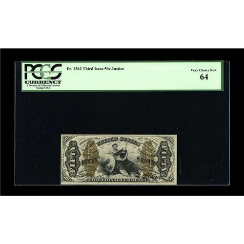 <B>Fr. 1362 50c Third Issue Justice PCGS Very Choice New 64.</B></I> A near Gem example and an ideal Green Back Justice. It has bright bronze and deep inks. Three of the margins are sizeable while the fourth at left is smaller but complete.<BR><BR><b>Shipping:</b> Coins & Currency (<a target="_blank" href="http://www.heritageauctions.com/common/shipping.php">view shipping information</a>)