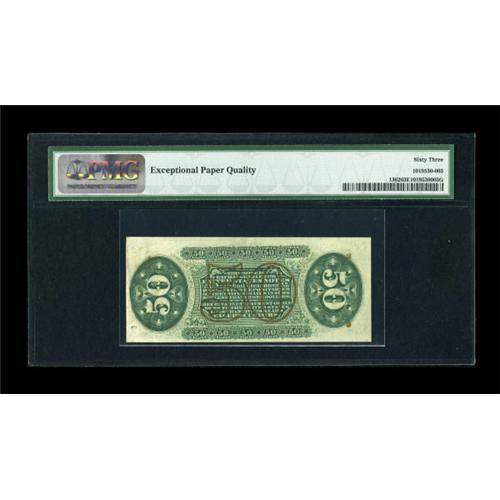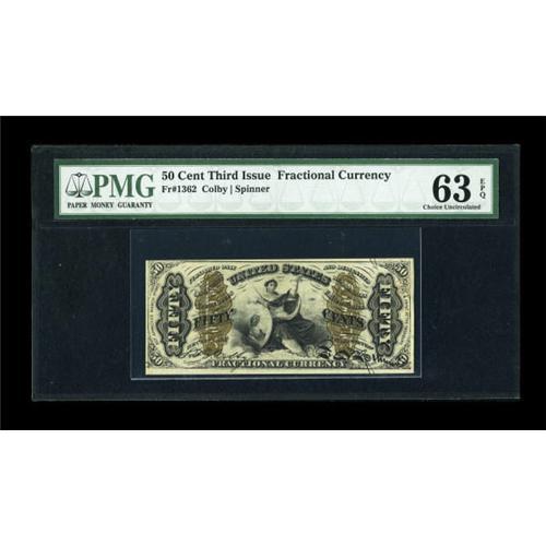<B>Fr. 1362 50c Third Issue Justice PMG Choice Uncirculated 63 EPQ.</B></I> The bronze underprint is bold on this well preserved note that is restricted in grade by tightness at the upper left corner on the face.<BR><BR><b>Shipping:</b> Coins & Currency (<a target="_blank" href="http://www.heritageauctions.com/common/shipping.php">view shipping information</a>)