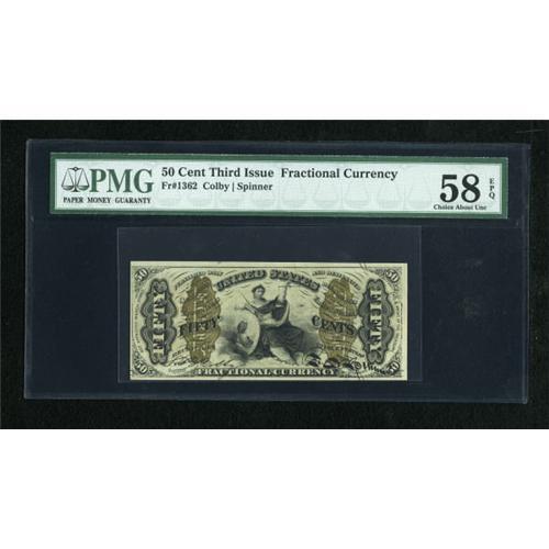 <B>Fr. 1362 50c Third Issue Justice PMG Choice About Unc 58 EPQ.</B></I> This Justice has a bright bronze overprint. <BR><BR><b>Shipping:</b> Coins & Currency (<a target="_blank" href="http://www.heritageauctions.com/common/shipping.php">view shipping information</a>)