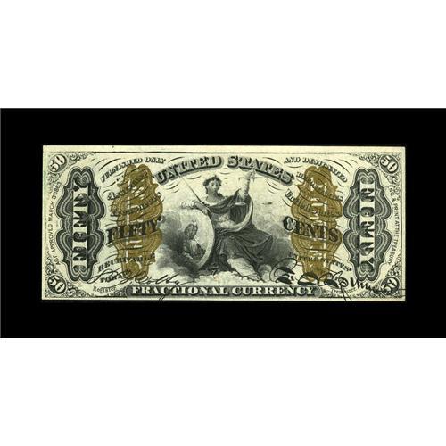 <B>Fr. 1363 50¢ Third Issue Justice About New.</B></I> A single, light center fold holds this "1" and "a" Justice from the Choice New grade. The face margins are exceptional for a Justice, and the appearance is enhanced by bright bronze and strong print quality.<BR><I>From The Jacob and Heather Dedman Collection</B></I><BR><BR><b>Shipping:</b> Coins & Currency (<a target="_blank" href="http://www.heritageauctions.com/common/shipping.php">view shipping information</a>)