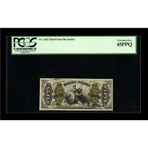 <B>Fr. 1363 50c Third Issue Justice PCGS Extremely Fine 45PPQ.</B></I> A well margined example of the ever popular "1" and "a" variety. Bright, well embossed paper is the norm here.<BR><I>From The Bill and Kathy Stella Currency Collection</B></I><BR><BR><b>Shipping:</b> Coin/Currency (<a target="_blank" href="http://www.heritageauctions.com/common/shipping.php">view shipping information</a>)