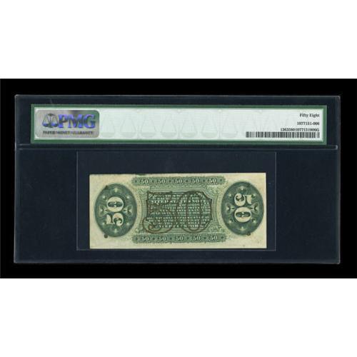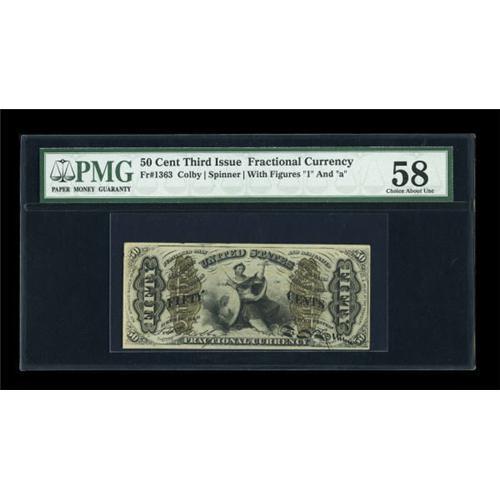 <B>Fr. 1363 50c Third Issue Justice PMG Choice About Unc 58.</B></I> Solid margins are noted on this attractive Justice. On the back is a partial plate number 12. No visible signs of wear are noted in the holder on this piece.<BR><BR><b>Shipping:</b> Coins & Currency (<a target="_blank" href="http://www.heritageauctions.com/common/shipping.php">view shipping information</a>)