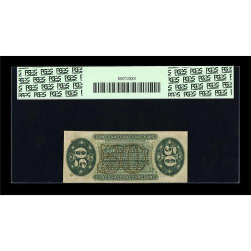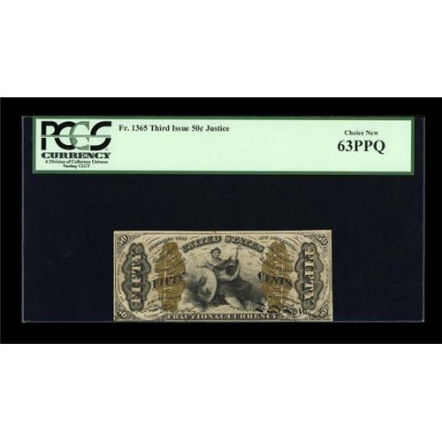 <B>Fr. 1365 50c Third Issue Justice PCGS Choice New 63PPQ.</B></I> Somewhat tight across the bottom, but a pure Gem in every other sense of the word, with blazing bright bronze, perfect ink and paper colors and excellent back centering. This is the only 63 graded by either major service, with just a single 64 above it. This will always remain a very scarce number at this grade level.<BR><I>From The Thomas M. Flynn Collection</B></I><BR><BR><b>Shipping:</b> Coins & Currency (<a target="_blank" href="http://www.heritageauctions.com/common/shipping.php">view shipping information</a>)