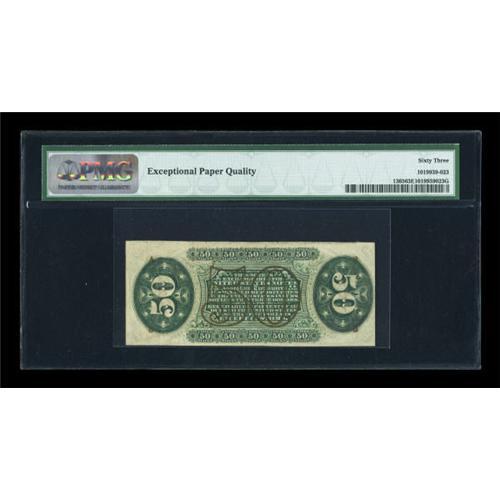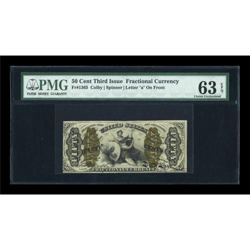 <B>Fr. 1365 50c Third Issue Justice PMG Choice Uncirculated 63 EPQ.</B></I> The tight left margin is all that has held this scarce Friedberg number from the full Gem grade. Everything else about the note is lovely, and it bears the important "Exceptional Paper Quality" comment.<BR><BR><b>Shipping:</b> Coins & Currency (<a target="_blank" href="http://www.heritageauctions.com/common/shipping.php">view shipping information</a>)