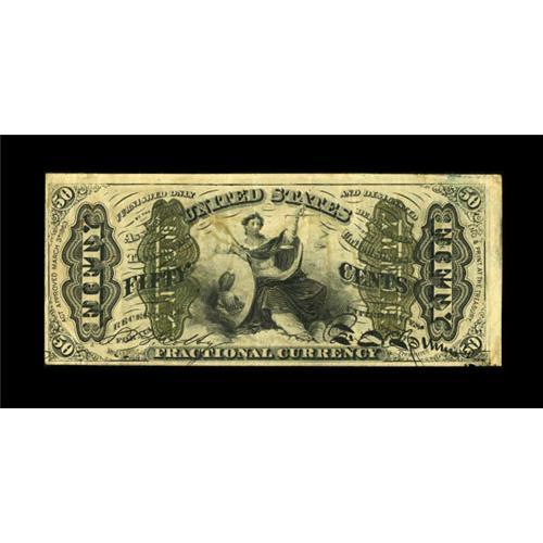 <B>Fr. 1365 50c Third Issue Justice Inverted Back Surcharge Very Fine.</B></I> This is a very pleasing example of a rare Justice invert. This is now the fourth example known with the last one we sold in the O'Mara sale realizing $632.50, and that was only a Fine. With the great price appreciation of the past couple of years and new collectors entering the fractional arena this is sure to be a four figure item.<BR><BR><b>Shipping:</b> Coins & Currency (<a target="_blank" href="http://www.heritageauctions.com/common/shipping.php">view shipping information</a>)
