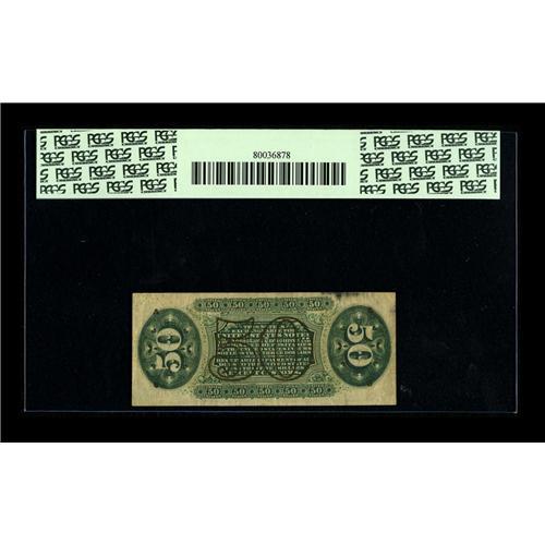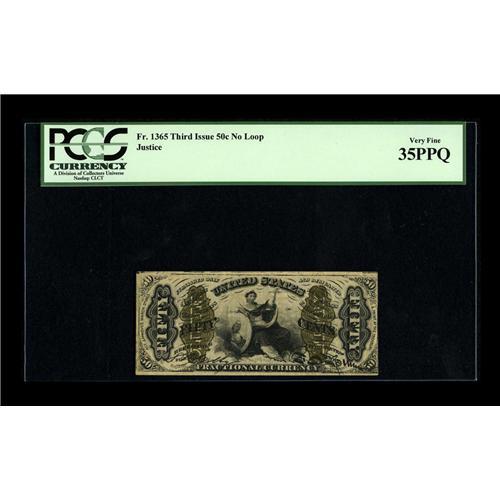 <B>Fr. 1365 Milton 3R50.10j 50¢ Third Issue Justice PCGS Very Fine 35PPQ.</B></I> This is one only three known examples of the very rare "no loop" 1365. Milt Friedberg's example when sold in 1997 was the sole known piece. When we sold Milt's example, we described it as having "... come from one of the two strangely configured plates used by the Bureau. The information in the rest of this description comes from an article written by Tom Knebl in <I>Paper Money Magazine</B></I> #73, page 17. The article relied heavily on an earlier <I>Paper Money</B></I> article written and researched by Martin Gengerke. The two oddly configured face plates were plate #62, a 30-subject plate arranged in three columns of ten notes with the design letter 'a' on the ten notes in the left-hand column, and plate #5, an identically configured 30-subject plate with the design letter 'a' on the top three notes. Spinner's large engraved signature goes off the note on the right and intrudes slightly into the left edge design of its right-hand neighbor. On the normally configured plate, the two notes with the design letter 'a' would show this signature loop. Any 'a' Justice without the signature loop and having some left margin would have to have come from plate 62 or the upper-left corner of plate 5." This note is clearly an upper-left-corner piece, as indicated by the plate impression as well as margin size. It could have come from either of the two odd plates. A nice acquisition for the fractional specialist.<BR><I>From The Bill and Kathy Stella Currency Collection</B></I><BR><BR><b>Shipping:</b> Coin/Currency (<a target="_blank" href="http://www.heritageauctions.com/common/shipping.php">view shipping information</a>)