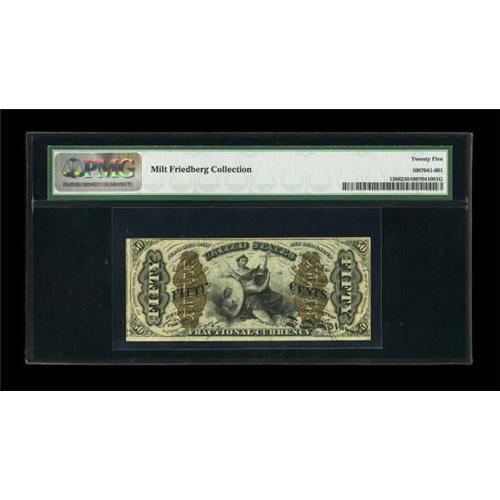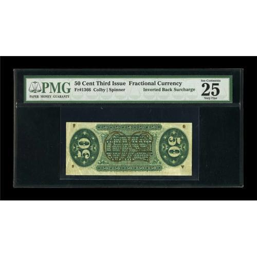 <B>Fr. 1366 50¢ Third Issue Justice Inverted Back Surcharge PMG Very Fine 25.</B></I> Previously Lot 835 from our January 1997 sale of the Milt Friedberg Collection. Fr. 1366 is a very rare Invert, with only three of four examples known. Fr. 1366 through 1369 is a rare series for Inverts, with only seven or eight known for all four numbers combined. This is a handsome, mid-grade piece with good color and far better than normal Justice centering. The Milt Friedberg Collection pedigree is mentioned on the PMG holder.<BR><BR><b>Shipping:</b> Coins & Currency (<a target="_blank" href="http://www.heritageauctions.com/common/shipping.php">view shipping information</a>)