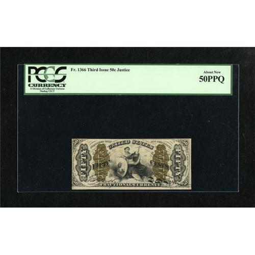 <B>Fr. 1366 50c Third Issue Justice PCGS About New 50PPQ.</B></I> This is a pleasing example of this scarce Justice variety with the back surcharges widely spaced. Typical margins for the issue are encountered.<BR><BR><b>Shipping:</b> Coins & Currency (<a target="_blank" href="http://www.heritageauctions.com/common/shipping.php">view shipping information</a>)