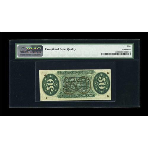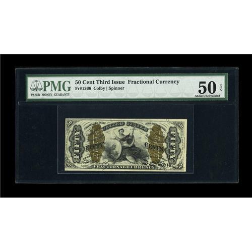 <B>Fr. 1366 50c Third Issue Justice PMG About Uncirculated 50 EPQ.</B></I> A lovely note with bright colors of the paper, inks and bronze, terrific original embossing and decent margins. The side margin is close at left, and the note has a light center fold. The start of a back plate number appears partially at lower right in the form of a # 3.<BR><BR><b>Shipping:</b> Coins & Currency (<a target="_blank" href="http://www.heritageauctions.com/common/shipping.php">view shipping information</a>)