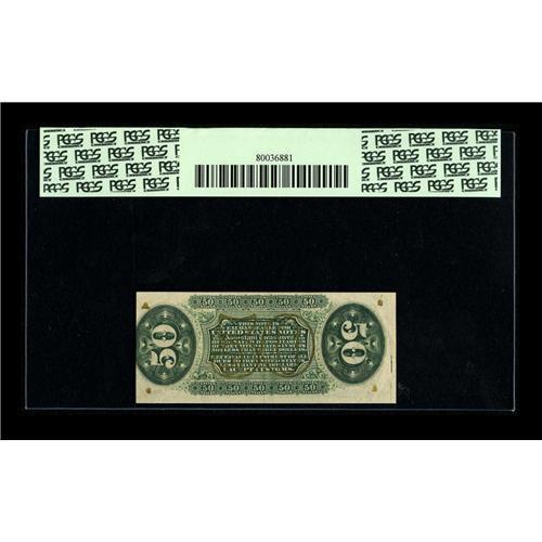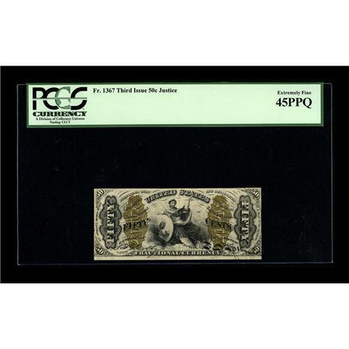 <B>Fr. 1367 50c Third Issue Justice PCGS Extremely Fine 45PPQ.</B></I> This is a perfectly natural and very attractive example of this very rare "1" and "a" Justice note. The bronze is beautifully bright, and the colors are excellent. The bottom margin is simply huge, and the other three quite small. CAA has offered about thirteen Fr. 1367's, including a number of repeats. This beautiful note should attract much attention.<BR><I>From The Bill and Kathy Stella Currency Collection</B></I><BR><BR><b>Shipping:</b> Coin/Currency (<a target="_blank" href="http://www.heritageauctions.com/common/shipping.php">view shipping information</a>)
