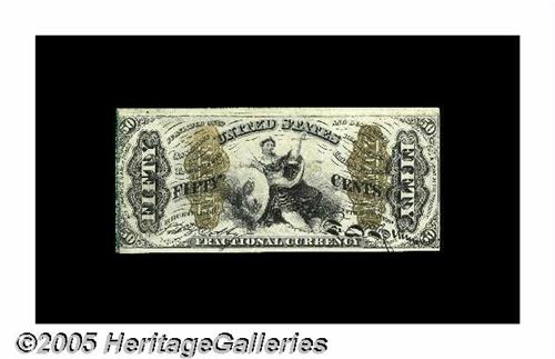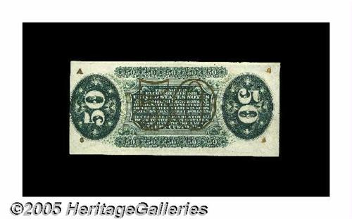 <B>Fr. 1367 Milton 3R50.11a 50¢ Third Issue Justice Very Choice New.</B></I> Beautifully bright, this is almost a dead ringer to the Milt Friedberg piece. That note had the same back centering, the same large top and bottom margins and a very similar press-bed smear at the left edge of the face. This piece, unlike the Friedberg example, has a right face margin along its entire length that never touches the frame line. Milt's note was the only Fr. 1367 we've ever sold that graded as high as Choice New, and this note is clearly its superior. On top of this piece's beautiful colors and exceptional centering, it also boasts bright bronze and obvious deep, original embossing. Milt's piece realized over $3,600 on an estimate of $2,500-up eight years ago. This piece should more than double that.