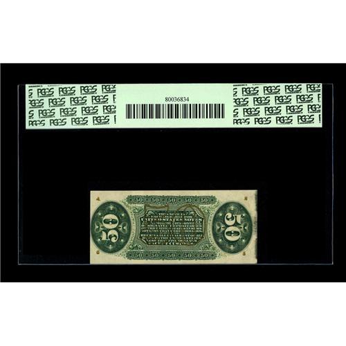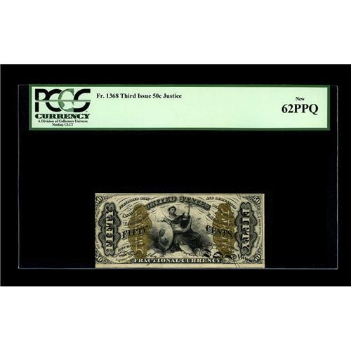 <B>Fr. 1368 50¢ Third Issue Justice PCGS New 62PPQ.</B></I> The left face margin cuts slightly into the design on this otherwise Very Choice example of a really tough number. It's the "1" variety from the second scarcest Justice run--the Green Backs with the widely spaced A-2-6-5 surcharge. Hard to find in any grade.<BR><I>From The Bill and Kathy Stella Currency Collection</B></I><BR><BR><b>Shipping:</b> Coin/Currency (<a target="_blank" href="http://www.heritageauctions.com/common/shipping.php">view shipping information</a>)
