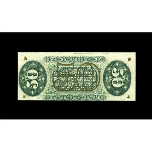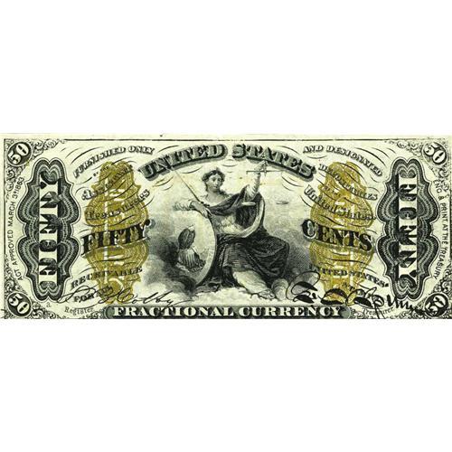 <B>Fr. 1368 50c Third Issue Justice Extremely Fine.</B></I> This is a bright note with embossing and bold bronze. It has a bottom margin along the frame line and it has been thrice-folded.