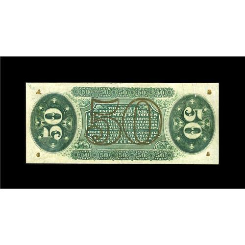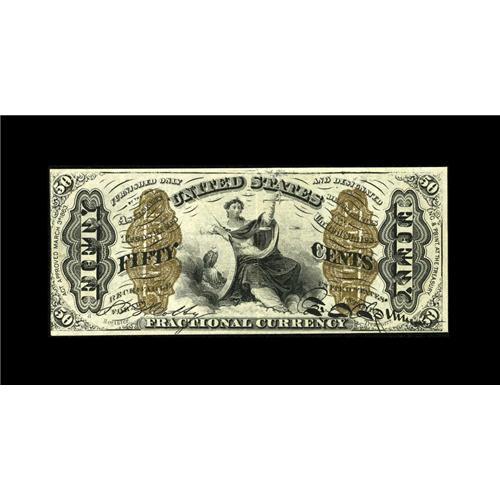 <B>Fr. 1369 50c Third Issue Justice Choice About New.</B></I> The fold at center is noticeable but very minor. We handled only one example of this scarce Friedberg number in 2006. This issue is attractive and boldly embossed.<BR><I>From The Bill and Kathy Stella Currency Collection</B></I><BR><BR><b>Shipping:</b> Coin/Currency (<a target="_blank" href="http://www.heritageauctions.com/common/shipping.php">view shipping information</a>)