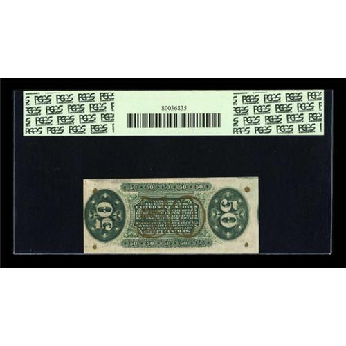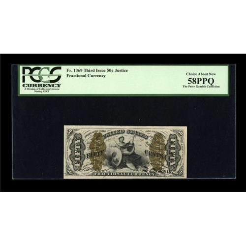 <B>Fr. 1369 50c Third Issue Justice PCGS Choice About New 58PPQ.</B></I> The face margins are as large as we've ever seen on a Justice note on this very rare number. The note has the appearance of a Superb Gem, though we suspect the 58 grade is due to a light centerfold. A gorgeous note that would slip into any Uncirculated set.<BR><I>From The Peter Gamble Collection.</B></I><BR><BR><b>Shipping:</b> Coins & Currency (<a target="_blank" href="http://www.heritageauctions.com/common/shipping.php">view shipping information</a>)