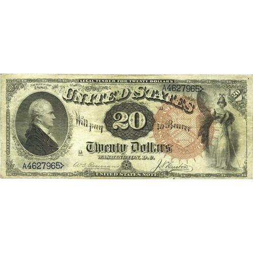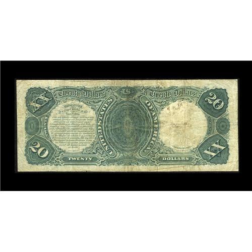 <B>Fr. 137 $20 1880 Legal Tender Fine-Very Fine.</B></I> A few pinholes are found on this evenly circulated example with sound edges. This Friedberg number is characterized by a large red Treasury seal with spikes.