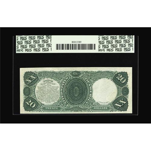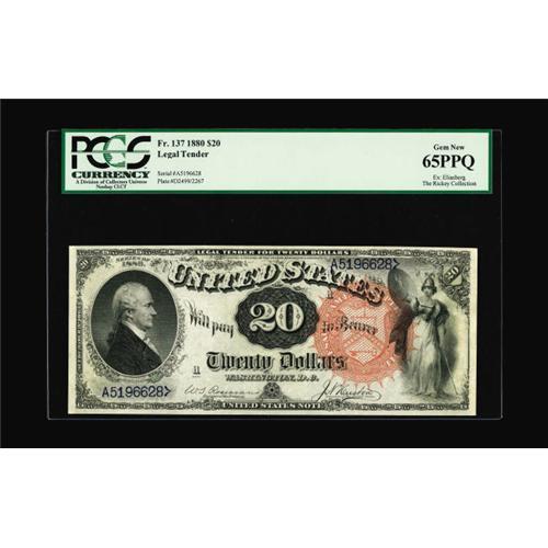 <B>Fr. 137 $20 1880 Legal Tender PCGS Gem New 65PPQ.</B></I>This well centered and broadly margined note is perfectly original with bright colors and paper. A survey of the note indicates this particular piece is more deeply embossed than is usually seen on this type. This note is plate position D from a cut sheet reported in the census. The other notes however have not been seen publicly offered sine the mid-1980's.<BR><I>From The Jeffrey L. Olyan Collection, Part 1</B></I>