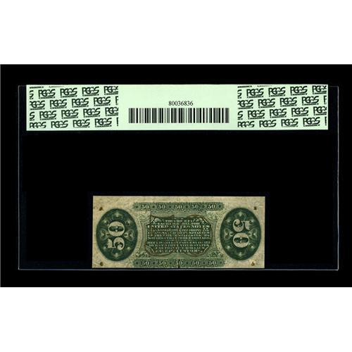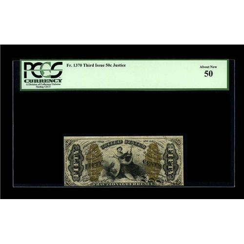 <B>Fr. 1370 50¢ Third Issue Justice PCGS About New 50.</B></I> Unusually bright for a fiber paper note and printed on particularly heavily-fibered, thick paper.<BR><I>From The Bill and Kathy Stella Currency Collection</B></I><BR><BR><b>Shipping:</b> Coin/Currency (<a target="_blank" href="http://www.heritageauctions.com/common/shipping.php">view shipping information</a>)