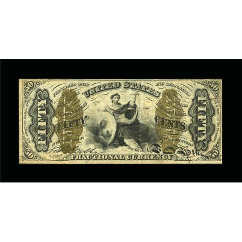 <B>Fr. 1370 50c Third Issue Justice About New.</B></I> This elusive Fiber Paper variety Justice has a dark bronze overprint while sporting the typical margins for this design, two close and two ample. The back is centered a little high, though overall it's an original paper beauty.<BR><BR><b>Shipping:</b> Coins & Currency (<a target="_blank" href="http://www.heritageauctions.com/common/shipping.php">view shipping information</a>)