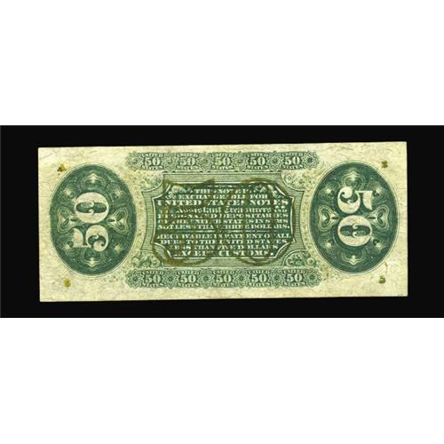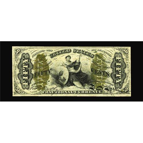<B>Fr. 1370 50c Third Issue Justice Gem New.</B></I> Fiber Paper Justices are almost never seen in this top grade. It's beautifully margined on both sides, bright and with excellent paper surfaces. We've seen very few of this number even near this nice. A special note for the finicky collector. Also to note the upper portions of a plate number are seen on the reverse in the lower right corner, possibly a "10" or a "16"...you decide.
