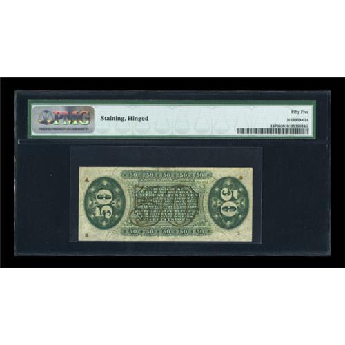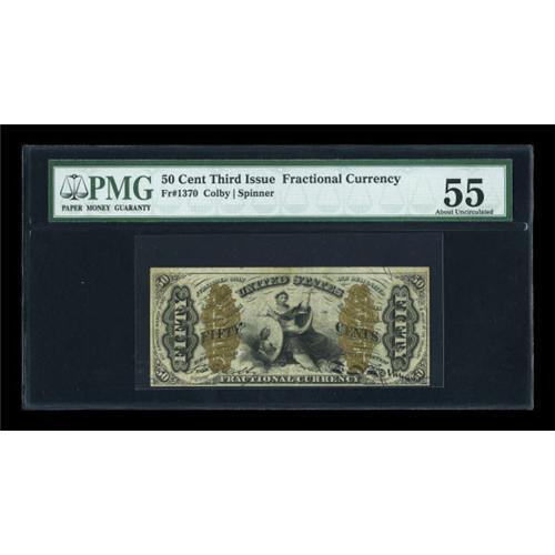 <B>Fr. 1370 50c Third Issue Justice PMG About Uncirculated 55.</B></I> A high-end fiber paper Justice with exceptional margins for the issue, good color and strong eye appeal. PMG has commented "Staining, Hinged." We can see the hinge mark, but the staining is a mystery. <BR><BR><b>Shipping:</b> Coins & Currency (<a target="_blank" href="http://www.heritageauctions.com/common/shipping.php">view shipping information</a>)